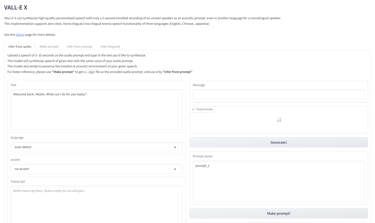 준비할 것은 5초 내외의 음성 데이터(영어, 일본어, 중국어 지원)와 그 대본입니다. 먼저 Uploaded audio prompt 위치에 음성 파일을 올리고 그 대본을 Transcript에 입력해주시면 됩니다. 그 이후 언어에 맞게 language를 선택해주시면 되고 accent의 경우는 언어 설정이 가능하지만 왜곡이 다소 생기기에 no-accent로 둡니다.