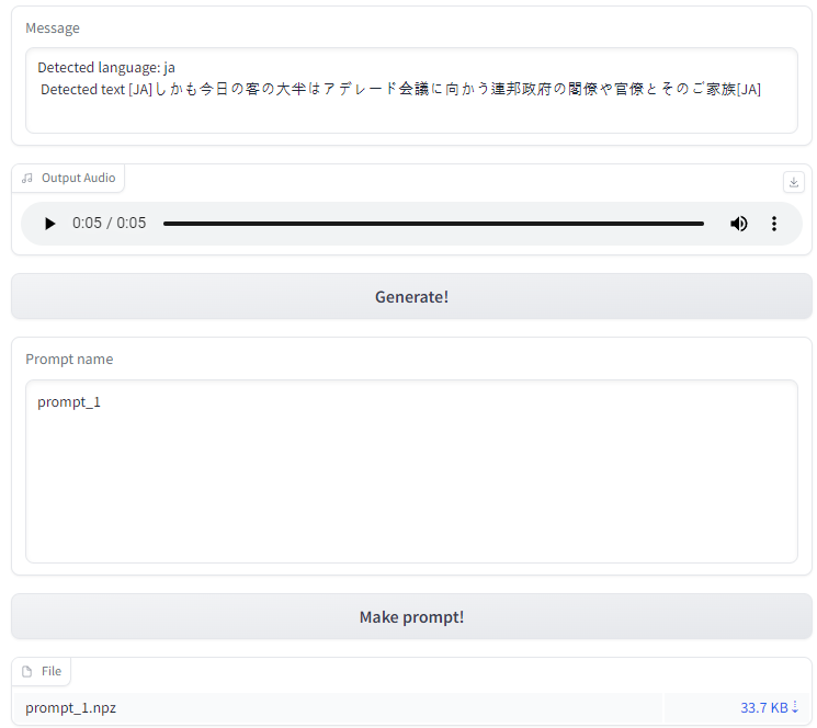 마찬가지로 우측 하단의 Make prompt를 누르면 학습된 모델 파일이 .npz 확장자로 생성이 됩니다. 원하시면 우측 버튼을 클릭하여 다운로드할 수 있습니다. 이 파일은 추후에 이 목소리로 다른 문장을 음성으로 만들고 싶을 때 프리셋처럼 사용할 수 있게 도와줍니다(Infer from prompt 등의 기능 사용).