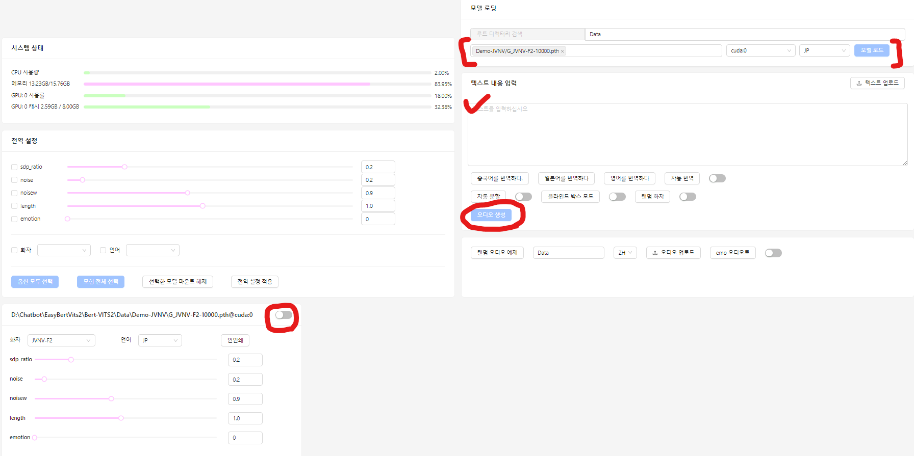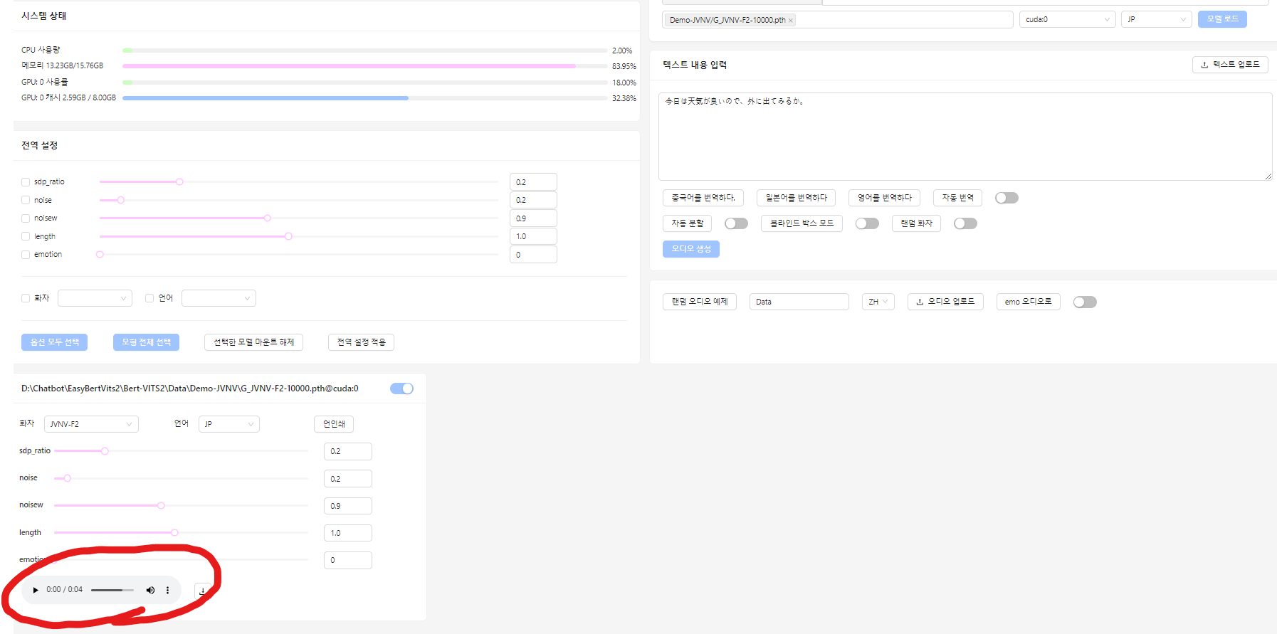 우선 기본적으로 제공되는 모델을 활용해봅니다. 우측 상단의 '모델 로딩'을 통해 'EasybertVits2/Bert-VITS2/Data' 폴더 안에 .pth 형식으로 저장되어있는 모델을 불러올 수 있습니다. 저는 기본 모델인 Demo-JVNV를 불러왔습니다.