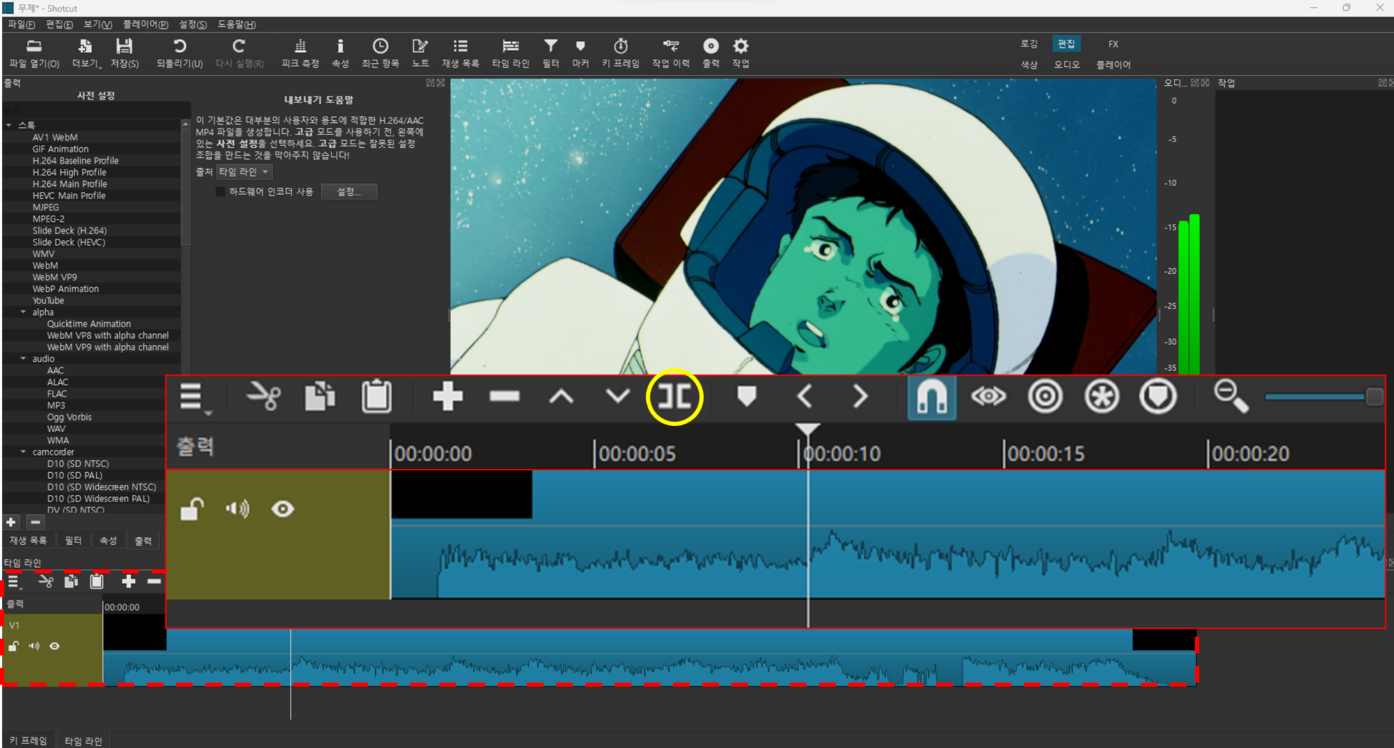 첫번째 방법으로는 동영상 편집 프로그램을 활용하는 것이 있습니다. 이 방식의 경우, Shotcut과 같이 무료로 배포하고 있는 프로그램을 활용하여 특정 캐릭터의 대사 부분만 잘라내서 별도의 파일로 저장합니다.