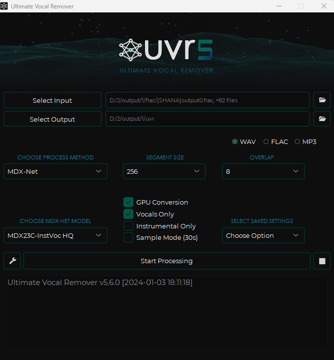 Input에는 flac 파일들을 Output에는 보정 후 파일들이 들어갈 폴더를 지정합니다. Process Method로는 MDX-Net을 고르시면 되고 MDX-NET Model의 경우는 MDX23C를 사용하도록 합니다. 다른 모델이 사용하고 싶으시면 프로그램 내에서 추가로 다운로드하실 수도 있습니다.