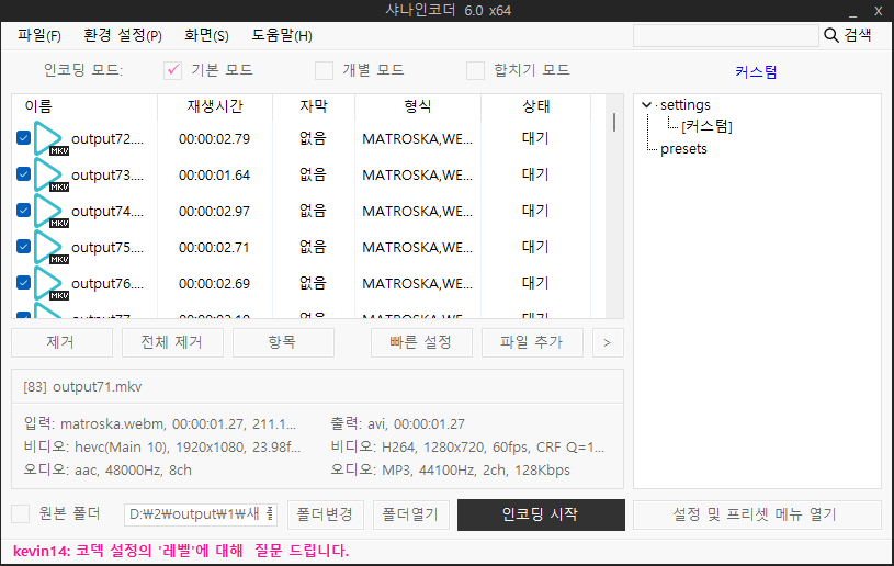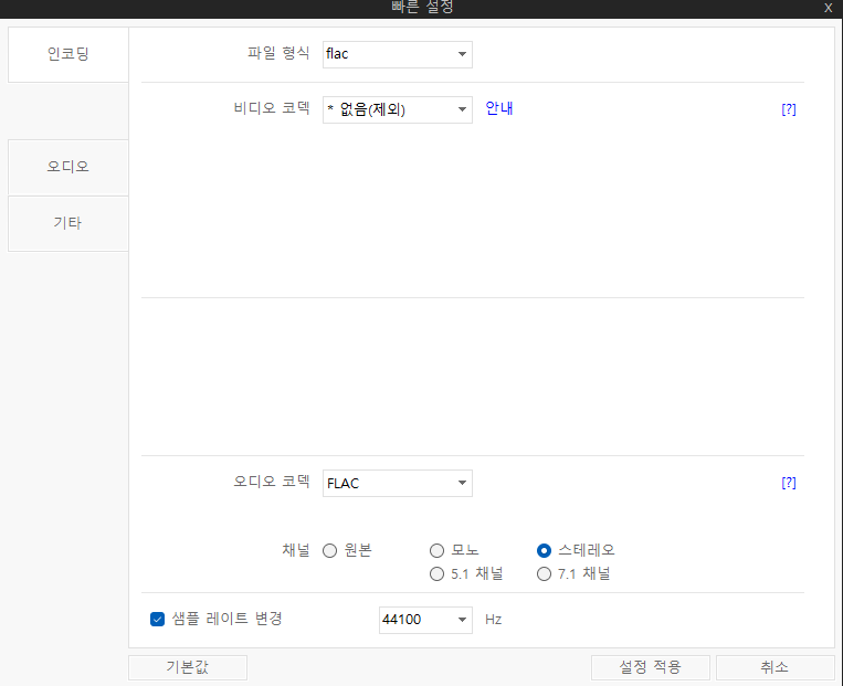 샤나인코더와 같은 인코딩 프로그램을 열어서 분리된 영상들을 넣어줍니다. 이 프로그램의 경우 빠른 설정 버튼을 통해 옵션에 진입해서 파일 형식(flac)과 샘플 레이트(44100Hz)를 설정해주고 인코딩을 진행합니다.