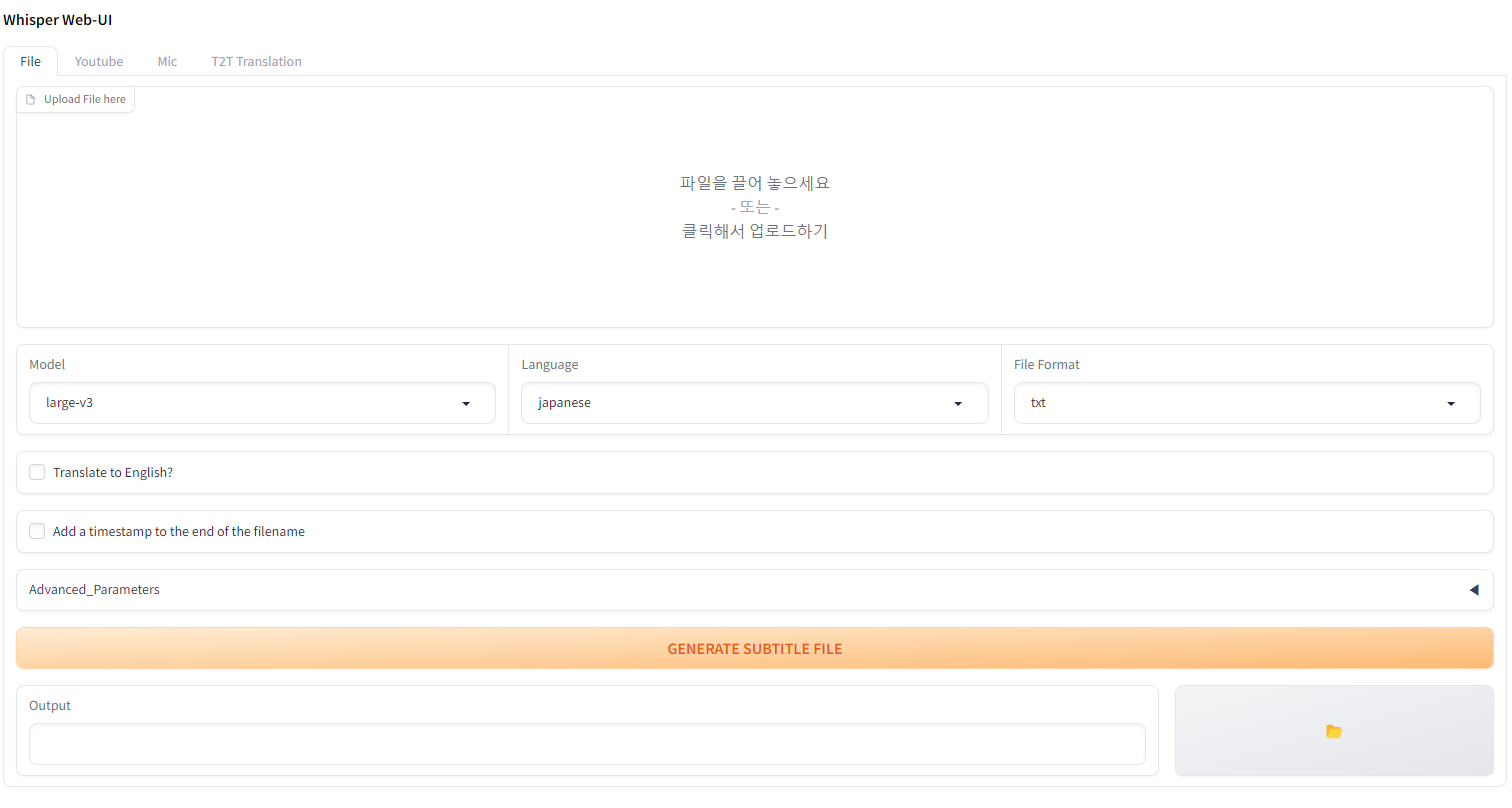 Whisper WebUI를 실행해보면 위와 같은 화면이 나오는데 여기서 Model은 large를 고릅니다. Language는 자신에게 맞는 언어, 파일 포맷은 .txt로 변환합니다. generate 버튼을 누르면 음성 파일의 대사를 인식하고 자동으로 .txt 파일로 정리해줍니다.