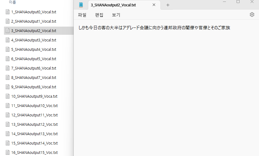 Whisper WebUI를 실행해보면 위와 같은 화면이 나오는데 여기서 Model은 large를 고릅니다. Language는 자신에게 맞는 언어, 파일 포맷은 .txt로 변환합니다. generate 버튼을 누르면 음성 파일의 대사를 인식하고 자동으로 .txt 파일로 정리해줍니다.