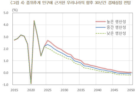 한국은행에 따르면 향후 30년간 국내의 GDP 성장은 위와 같은 추이를 가집니다. 2020년대 2.0~2.5%를 시작으로 2030년대 0.5~1.1%, 2040년대 -0.3~0.4%의 경제성장률을 예상하고 있습니다.