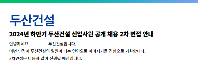 두산건설의 경우 1차 면접 결과가 12월에 발표되었는데, 우연히도 삼성그룹 결과 발표일 오전에 이루어졌습니다. 때문에 처음에는 면접 참석으로 회신을 드렸다가 결과 발표 후 불참 메일을 보내드린 기억입니다.